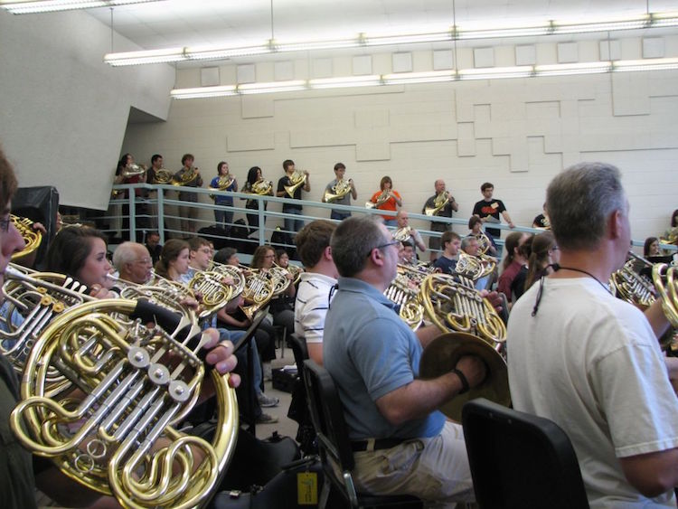 - 600 audience members collectively turning their heads as they were surprised by the off-stage calls in the Hunting Scenes from Rossini's William Tell—performed by Bill Klingelhoffer and Andrew Pelletier and an ensemble of sixteen symposium hornists.