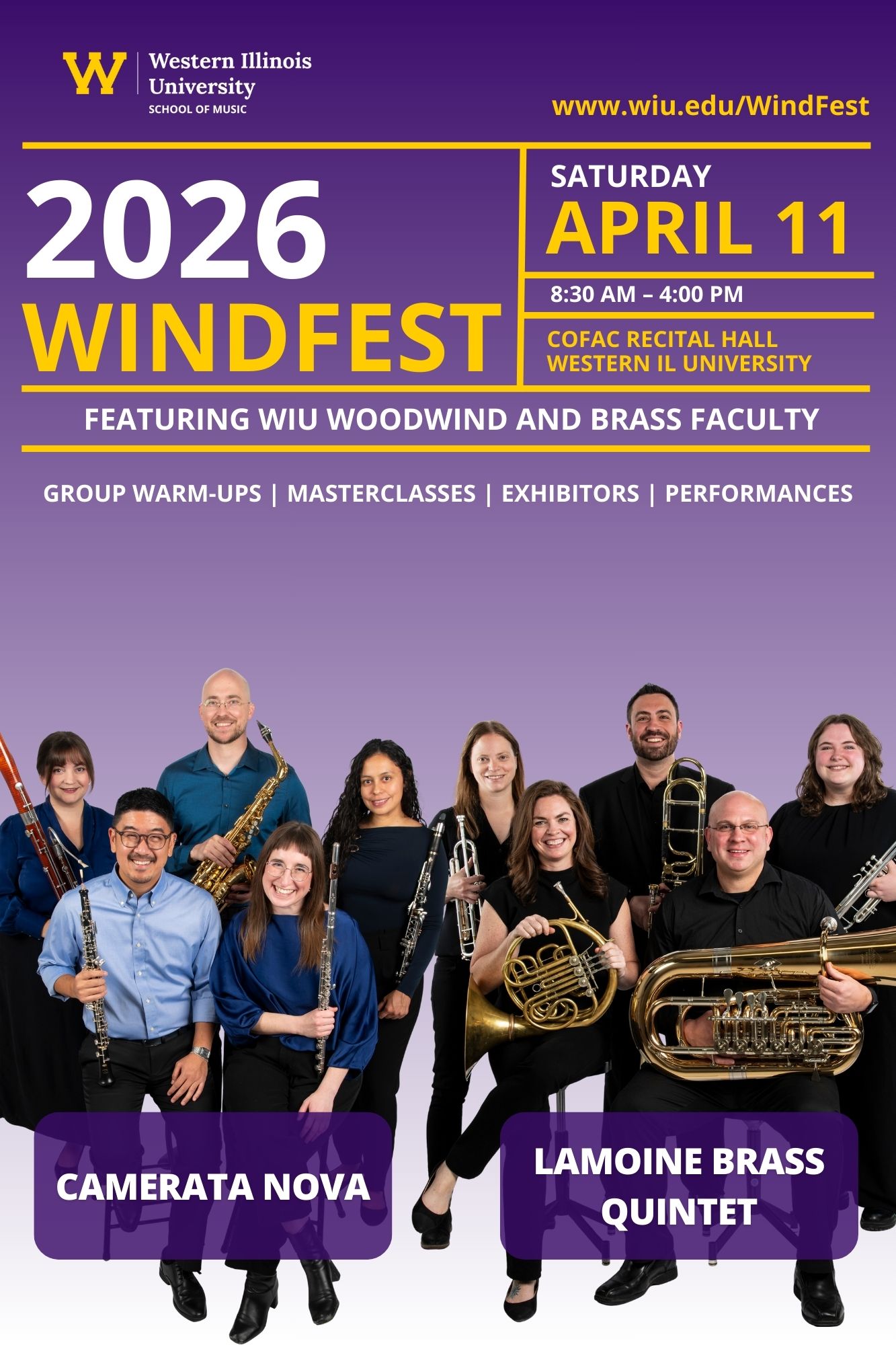 The Western Illinois University Windfest is an annual event hosted by the La Moine Brass Quintet and Camerata Nova. The day features performances instrumental masterclasses, clinics, and opportunities throughout for attendees to play!